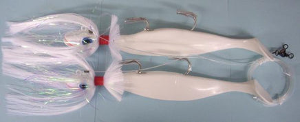 The Blue Water Candy Tandem Parachute Rig features a 3-way swivel with a 14' and a 4' 100# mono leader attaching to coastlock swivels. Loaded with 9" shad and parachutes.