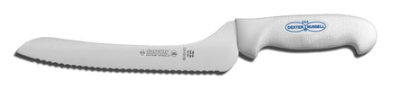 The SofGripâ„¢ product line is the standard in non-slip and comfortable design for demanding kitchen environments. A software rubber grip reduces stresses that may cause fatigue and common wrist injuries like carpal tunnel syndrome. Dexter scalloped blades are manufactured from proprietary DEXSTEELâ„¢ stain-free, high-carbon steel are individually ground to create specially designed scallops forming multiple sharp cutting edges. The points of the scallops easily break through rough rinds and pierce the firm skin of fruits and vegetables and also protect the sharp cutting edges. After breaking through the tough outer surface, the curved scalloped edges slice through soft interiors without damaging them. Made in USA. Items marked with the NSF logo are NSF Certified.