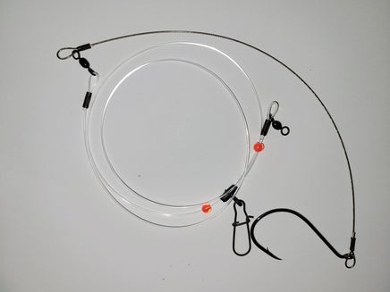 Perfect for casting from shore into the foamy waves, the Tsunami® Surf Shark Octopus Hook Rig is built with the kind of expertise needed to successfully turn and land most inshore sharks. Purposefully designed by the expert anglers at Tsunami and assembled with high-end components. The ultra-sharp and relentless octopus hook is made of heavy-duty wire. This shark rig is made with 60-lb.-test monofilament, so it won't fail when the action heats up. This saltwater fishing rig comes equipped with a fish finder with a snap that attaches to a sinker (not included).
