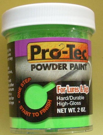 Imagine a paint with virtually no odor, no drying time, no solvents and no mixing. Now imagine a brilliant, super-durable high gloss finish in seconds! These qualities, coupled with a spectrum of colors to choose from, have made Pro-Tec Powder Paint the obvious choice for thousands of consumers worldwide.A paint that requires no primer coat and no gloss coat translates into more money in your pocket. In fact, 2 ounces of Pro-Tec Powder Paint will cover over 450 of your 3/8 oz. jigs. Combine that with a painting process that takes less than 20 minutes from start to finish and you've got an unbeatable product.