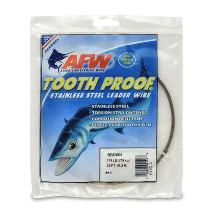 Tooth Proof leader wire lives up to its name and provides maximum protection against the ferocious jaws of Barracuda, King Mackerel, Wahoo and other toothy fish. Made from specially controlled Type 304 stainless steel alloy to be hard, but not brittle, and to deliver the perfect combination of flexibility and strength. Tooth Proof possesses incomparable abrasion resistance and tames the toughest toothy fish. AFW's unique pre-straightening process eliminates cast, providing a straighter leader wire with improved kink resistance. Special Camouflaged Brown finish vanishes in deep water. Tournament tested tough, this proven leader wire continues to put anglers on the winner board!