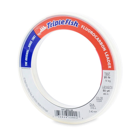 Triple Fish Fluorocarbon Leader offers a great value for inshore and offshore anglers alike. Now you can step up to using fluorocarbon leader without stepping into the poor house. Triple Fish fluorocarbon is made from 100% polyvinylidene fluoride which closely matches the light refractivity of water and is virtually invisible underwater. It is heavier than monofilament so it has a faster sink rate. And it is also more abrasion resistant than mono, so it stands up well to chaffing and basic wear-and-tear.