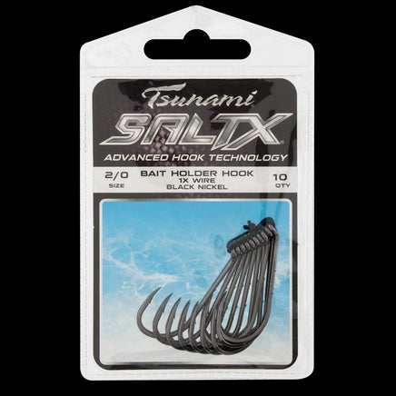 Gripping natural and soft plastics baits with its barbed shank, the Tsunami SaltX 1X Bait Holder Hooks are a great solution to even the best bait stealers out there. Its lighter wire is backed by its 100% Bekaert Wire construction, giving it great strength. Its black nickel finish protects the hook from corrosion, while also reducing its inherit friction, resulting in faster penetration.