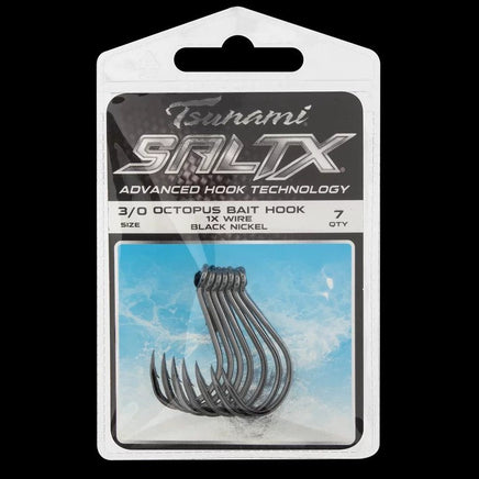 The Tsunami SaltX 1X Octopus Bait Hooks are a light wire option for both fresh and saltwater use. Ideal for rigging live and dead baits, each hook is constructed of a 100% Bekaert Wire, giving it great strength. Its black nickel finish protects the hook from corrosion, while also reducing its inherit friction, resulting in faster hook ups.