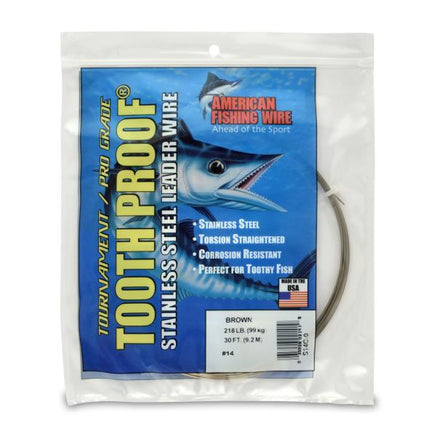 Tooth Proof leader wire lives up to its name and provides maximum protection against the ferocious jaws of Barracuda, King Mackerel, Wahoo and other toothy fish. Made from specially controlled Type 304 stainless steel alloy to be hard, but not brittle, and to deliver the perfect combination of flexibility and strength. Tooth Proof possesses incomparable abrasion resistance and tames the toughest toothy fish. AFW's unique pre-straightening process eliminates cast, providing a straighter leader wire with improved kink resistance. Special Camouflaged Brown finish vanishes in deep water. Tournament tested tough, this proven leader wire continues to put anglers on the winner board!
