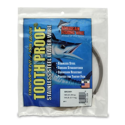 Tooth Proof leader wire lives up to its name and provides maximum protection against the ferocious jaws of Barracuda, King Mackerel, Wahoo and other toothy fish. Made from specially controlled Type 304 stainless steel alloy to be hard, but not brittle, and to deliver the perfect combination of flexibility and strength. Tooth Proof possesses incomparable abrasion resistance and tames the toughest toothy fish. AFW's unique pre-straightening process eliminates cast, providing a straighter leader wire with improved kink resistance. Special Camouflaged Brown finish vanishes in deep water. Tournament tested tough, this proven leader wire continues to put anglers on the winner board!