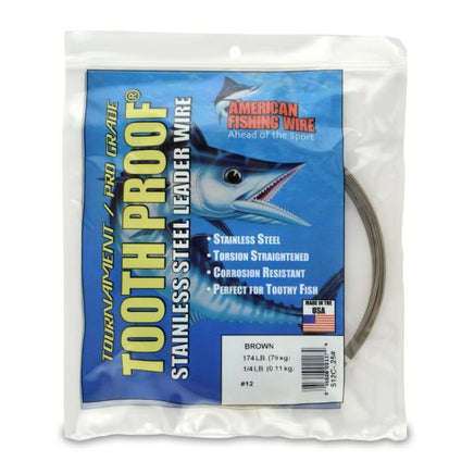 Tooth Proof leader wire lives up to its name and provides maximum protection against the ferocious jaws of Barracuda, King Mackerel, Wahoo and other toothy fish. Made from specially controlled Type 304 stainless steel alloy to be hard, but not brittle, and to deliver the perfect combination of flexibility and strength. Tooth Proof possesses incomparable abrasion resistance and tames the toughest toothy fish. AFW's unique pre-straightening process eliminates cast, providing a straighter leader wire with improved kink resistance. Special Camouflaged Brown finish vanishes in deep water. Tournament tested tough, this proven leader wire continues to put anglers on the winner board!