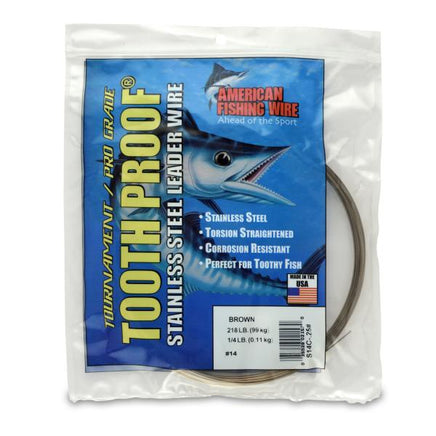 Tooth Proof leader wire lives up to its name and provides maximum protection against the ferocious jaws of Barracuda, King Mackerel, Wahoo and other toothy fish. Made from specially controlled Type 304 stainless steel alloy to be hard, but not brittle, and to deliver the perfect combination of flexibility and strength. Tooth Proof possesses incomparable abrasion resistance and tames the toughest toothy fish. AFW's unique pre-straightening process eliminates cast, providing a straighter leader wire with improved kink resistance. Special Camouflaged Brown finish vanishes in deep water. Tournament tested tough, this proven leader wire continues to put anglers on the winner board!