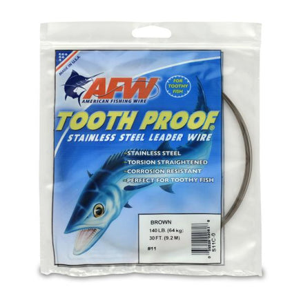 Tooth Proof leader wire lives up to its name and provides maximum protection against the ferocious jaws of Barracuda, King Mackerel, Wahoo and other toothy fish. Made from specially controlled Type 304 stainless steel alloy to be hard, but not brittle, and to deliver the perfect combination of flexibility and strength. Tooth Proof possesses incomparable abrasion resistance and tames the toughest toothy fish. AFW's unique pre-straightening process eliminates cast, providing a straighter leader wire with improved kink resistance. Special Camouflaged Brown finish vanishes in deep water. Tournament tested tough, this proven leader wire continues to put anglers on the winner board!