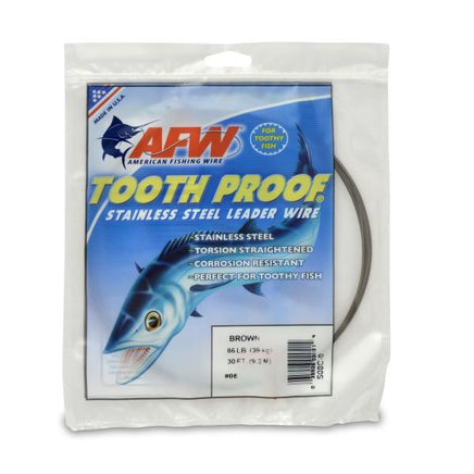 Tooth Proof leader wire lives up to its name and provides maximum protection against the ferocious jaws of Barracuda, King Mackerel, Wahoo and other toothy fish. Made from specially controlled Type 304 stainless steel alloy to be hard, but not brittle, and to deliver the perfect combination of flexibility and strength. Tooth Proof possesses incomparable abrasion resistance and tames the toughest toothy fish. AFW's unique pre-straightening process eliminates cast, providing a straighter leader wire with improved kink resistance. Special Camouflaged Brown finish vanishes in deep water. Tournament tested tough, this proven leader wire continues to put anglers on the winner board!